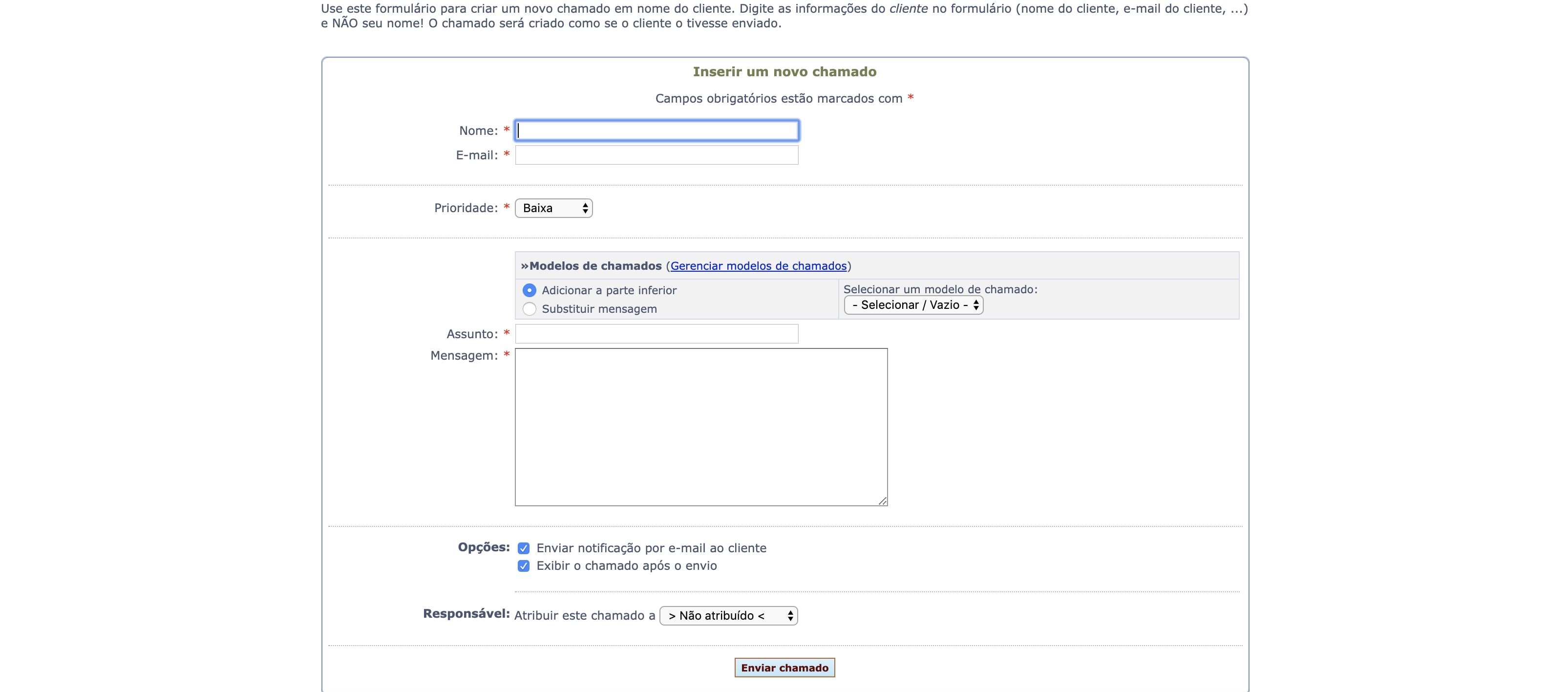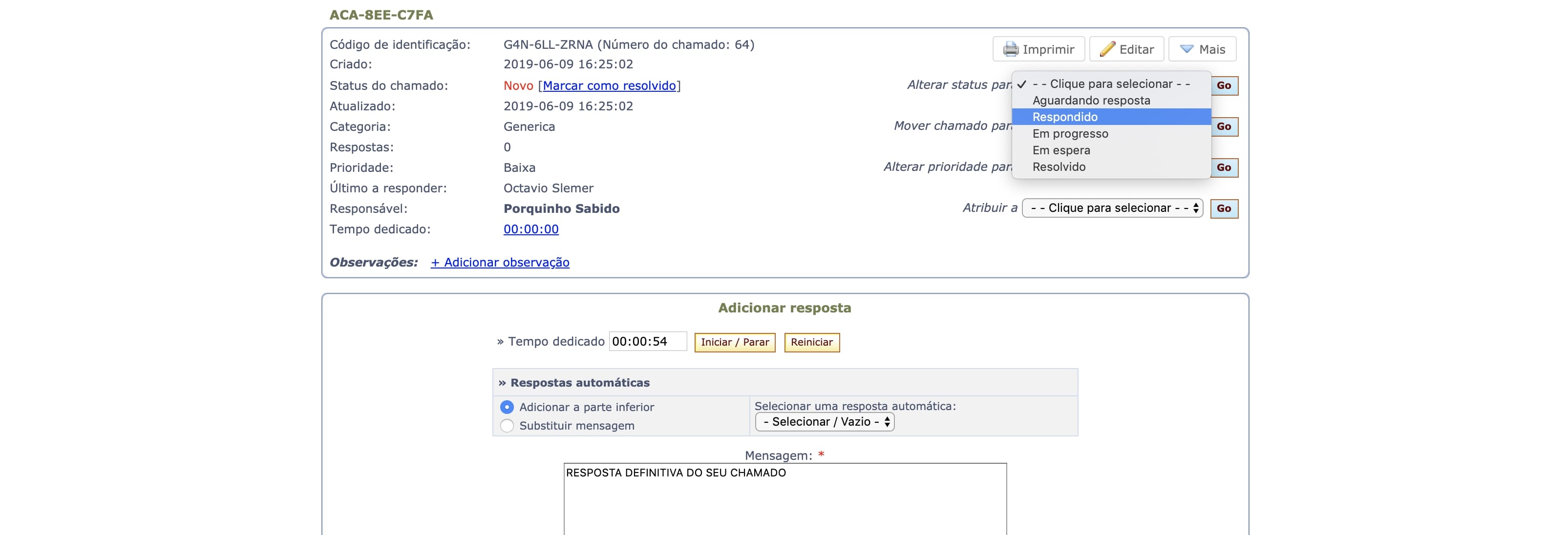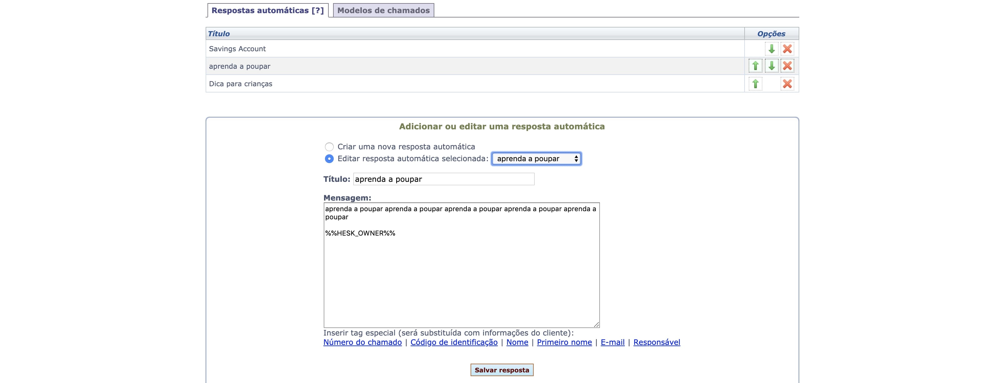 O sistema permite a criação de 'templates' com respostas padrão de atendimento, as quais estarão disponiveis para a Equipe de Atendimento de maneira a uniformizar e agilizar o atendimento de problemas específicos.