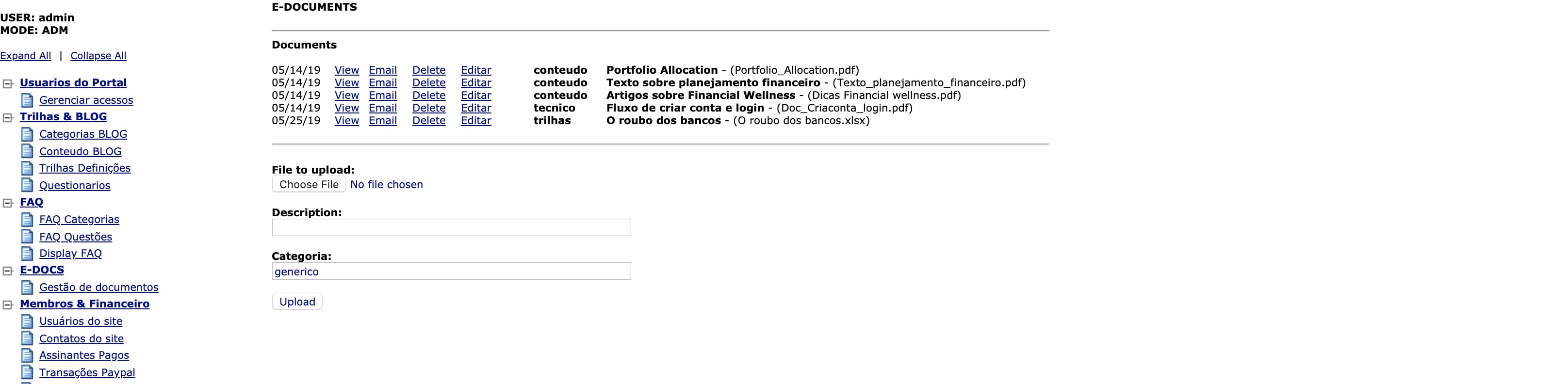 A plataforma permite o armazenamento de arquivos que poderão ser colocados a disposição dos clientes através do conteudos e trilhas. Na aba E-Documentos podem ser gerenciados varios tipos de documento como WORD, EXCEL, PDF e outros tipos