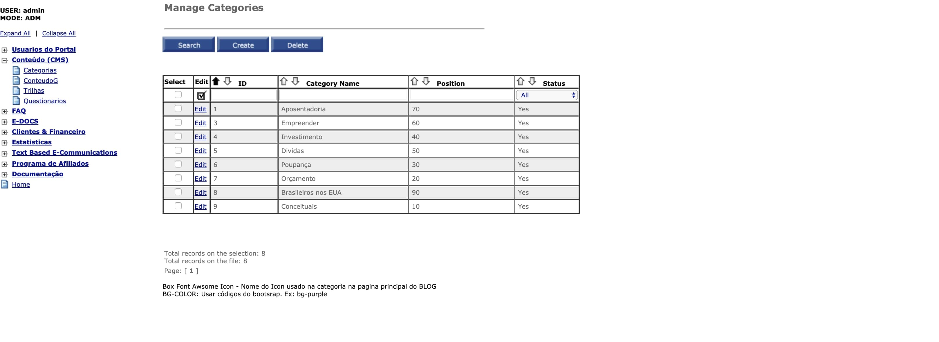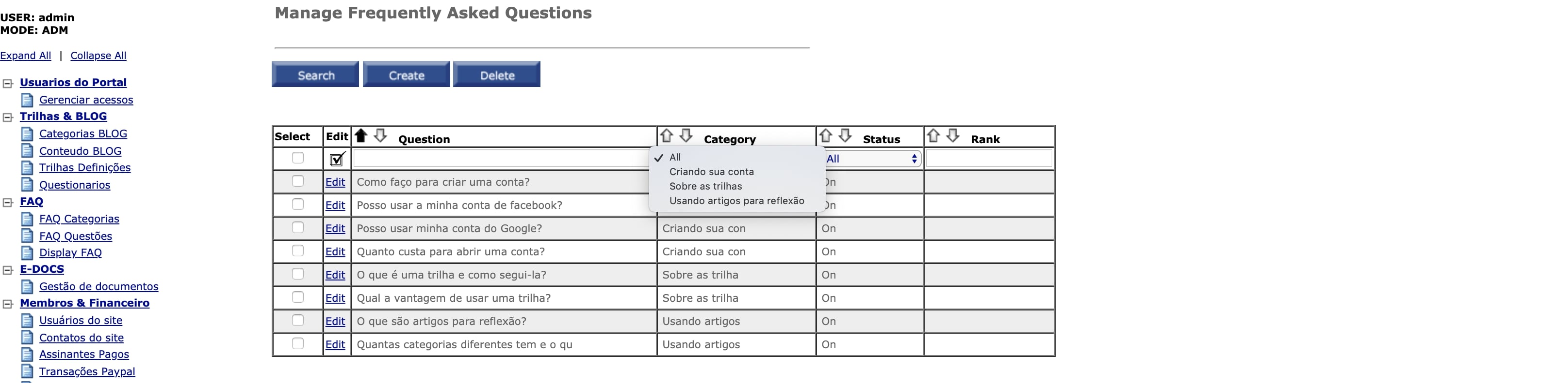 As CATEGORIAS são na verdade a primeira definição que o operador do site deverá efetuar, pois influi em toda a navegabilidade do site a começar por a) Exibição do menu principal em todas as páginas do site, b) Requerida na associação de conteúdo, trilhas e questionários, c) Opcionalmente pode ser usada no redirecionamento de chamados de CONTATE EM ESPECIALISTA para provocar o redirecionamento correto aos profissionais especificos por tema.