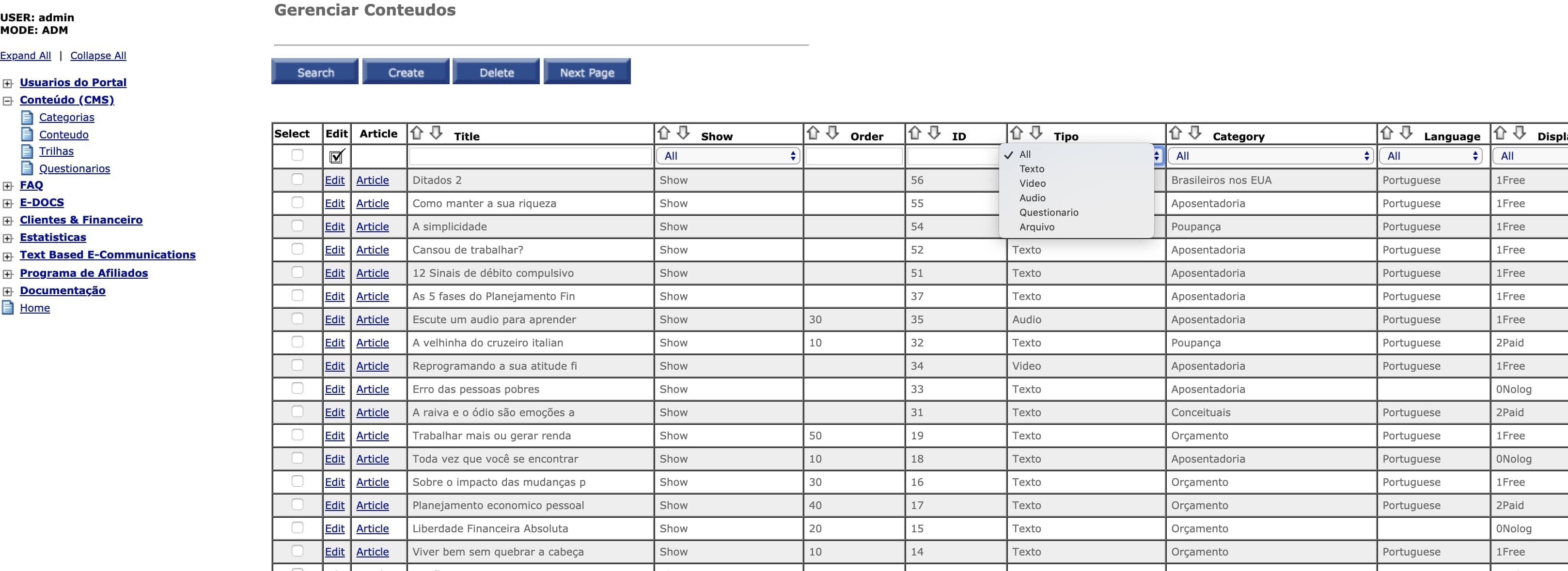 Os conteúdos são a parte critica da plataforma. Cada conteúdo criado é associado a uma categoria. Os conteúdos podem ser textos, videos, audios ou arquivos. Os conteúdos gerados como TEXTO alem de fazerm parte das trilhas são exibidos também como BLOG. A plataforma permite várias configurações parea um conteúdo. Sugerimos que você se familizarize extensamente com esta funcionalidade. Os conteúdos assim como as trilhas podem ser abilitados com diferentes status de pagamento: a) 0Nolog - Disponível a qualquer cliente no site com ou sem login - acesso livre, b) 1Free - Acesso gratuito mas requer a criação de uma conta grátis, c) 2Paid - Requer uma assinatura paga como Premium ou Avançado.