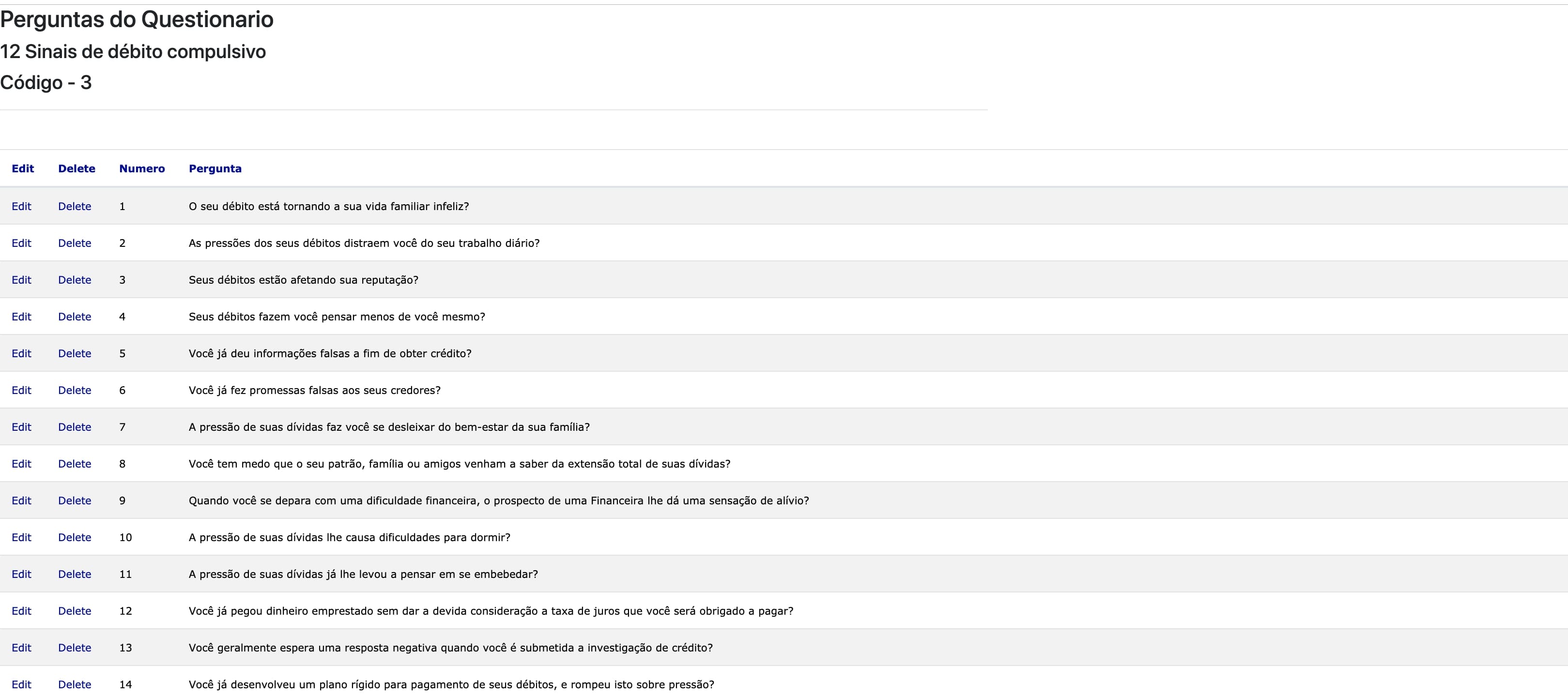 O sistema permite a simples criação de questionários com um número ilimitado de perguntas cujas respostas devam ser apenas (SIM ou NÃO). Questionarios (como os demais conteúdos) também são associados a cetegorias. No formulário de criação existe um campo para adionar a reesposta e os níveis de avaliação que serão exibidos ao cliente quando o mesmo termina de responder o questionario.