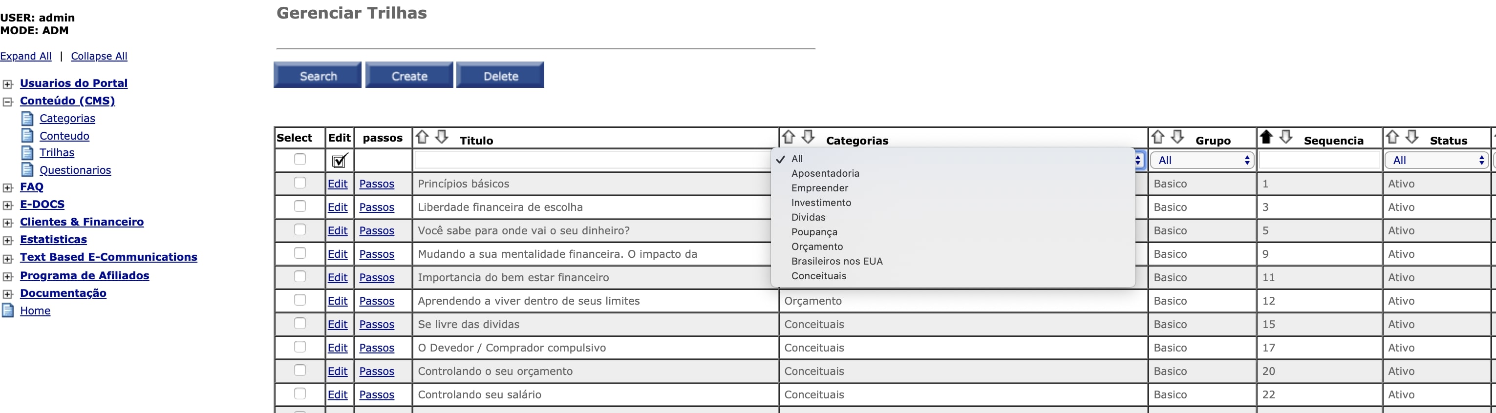 Toda a navegabilidade do site é baseada em CATEGORIAS. Todas as TRILHAS e todos os CONTEÚDOS/BLOGS são associados a uma CATEGORIA. As CATEGORIAS são criadas usando o MODULO de conteudo (CMS). Sugerimos que não sejam criadas mais do que 9 categorias para permitir uma navegabilidade transparente para o cliente.