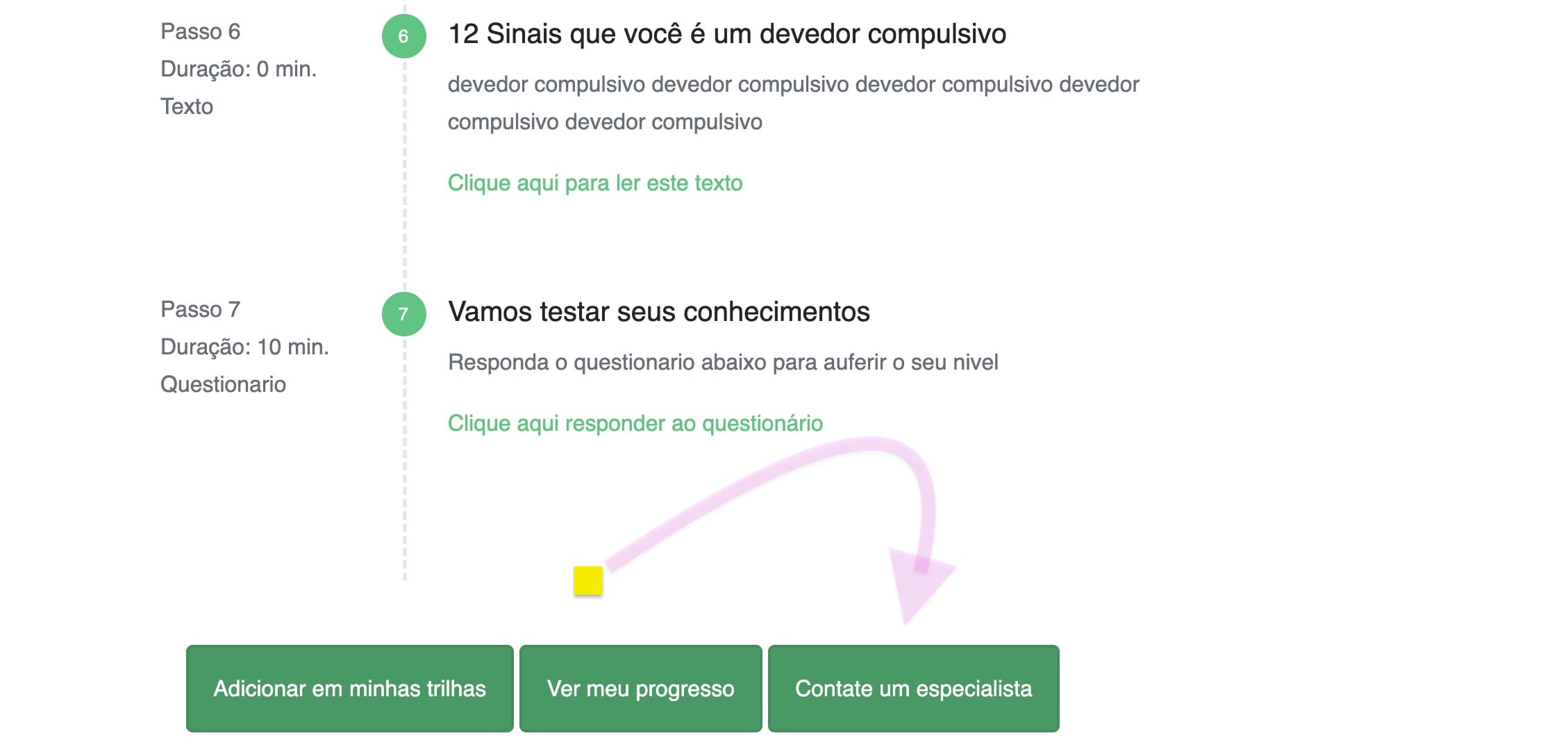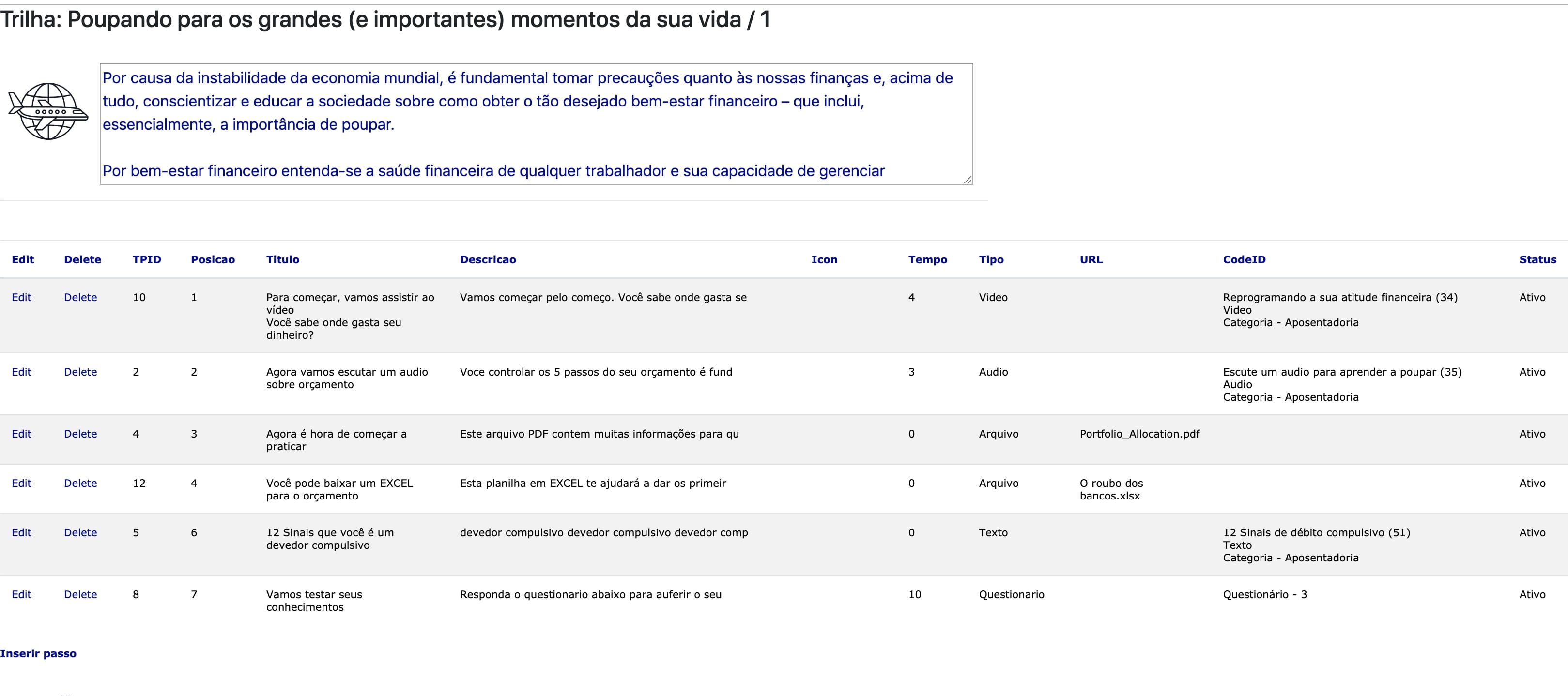 Ao criar uma TRILHA você associa a uma categoria e eine os parametros básico. Na sequencia você deverá criar os PASSOS. Não existem limites para o número de passos em uma trilha porem para uma melhor navegabilidade e aceitação por parte do cliente sugerimos um máximo de 7 passos.