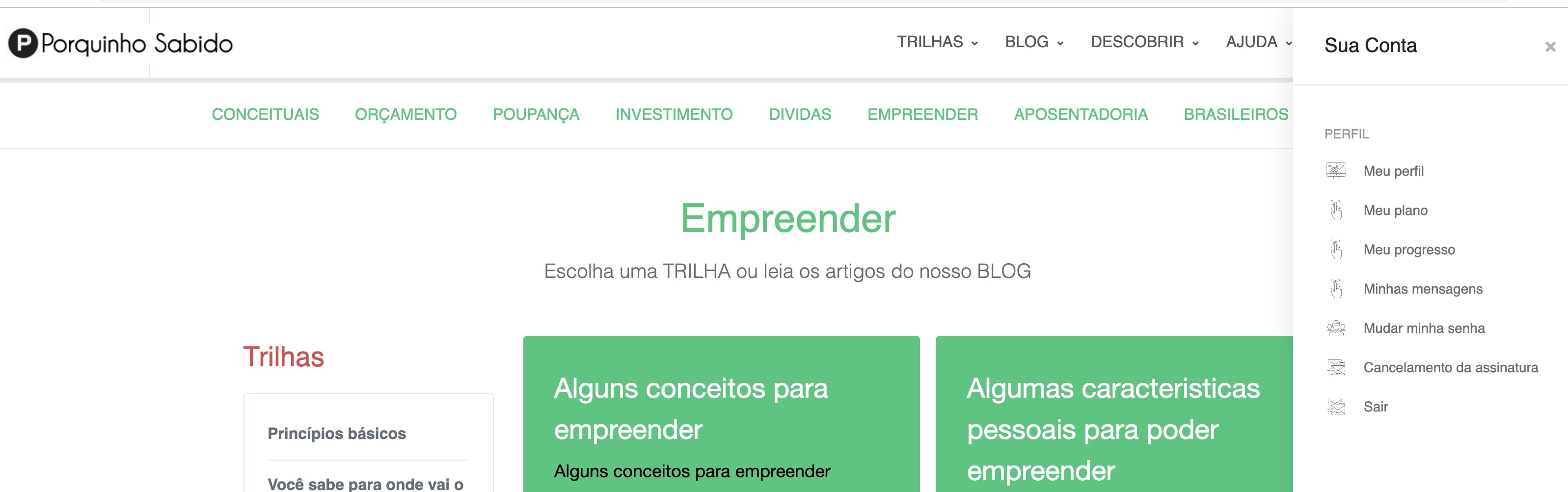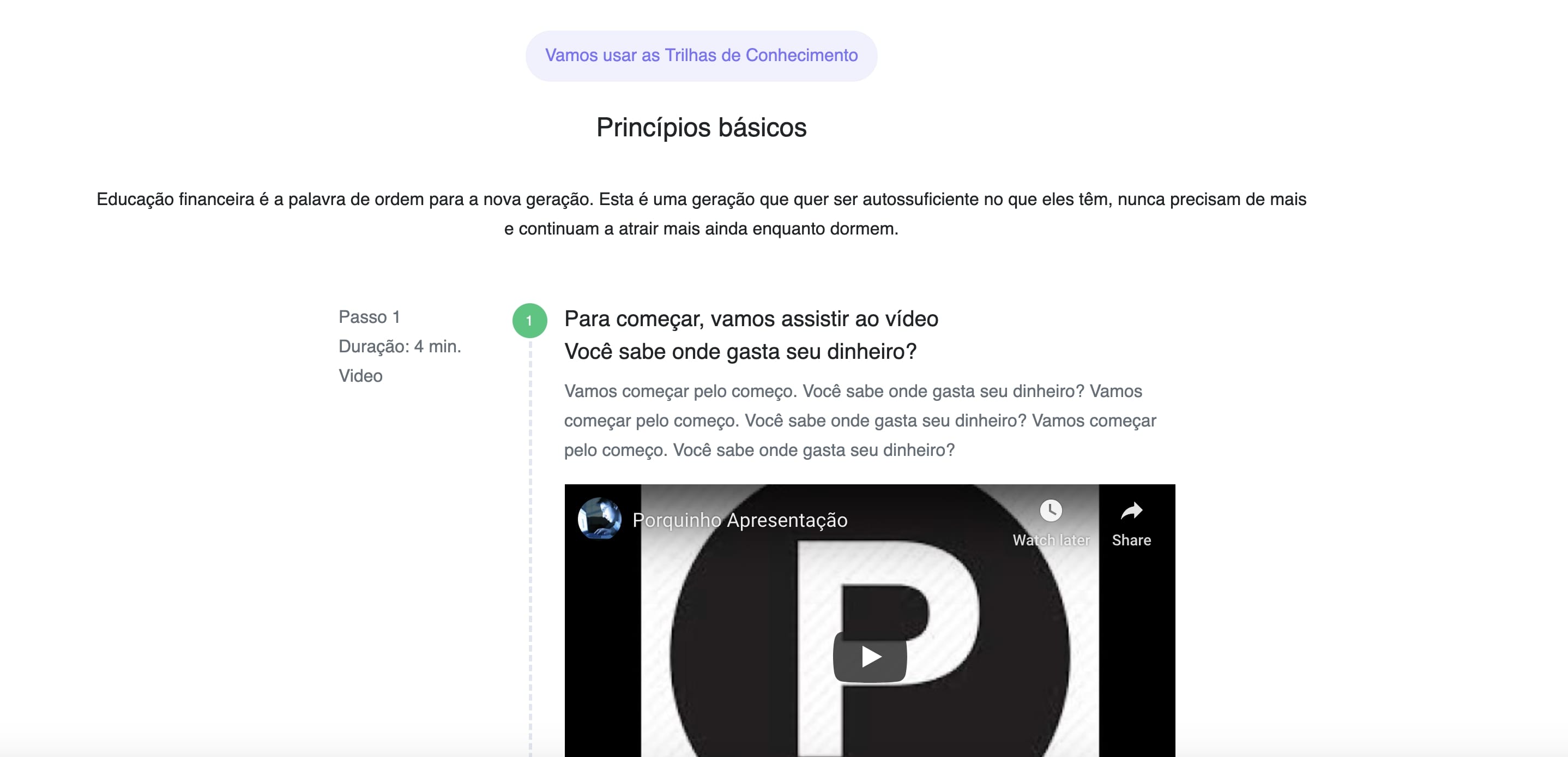 O sistema de TRILHAS é elemento fundamental do funcionamento do Porquinho Sabido. As TRILHAS são associadas a CATEGORIAS e são definidas contendo vários PASSOS. Os PASSOS podem ser vídeos, audios, textos, arquivos (todos definidos como conteúdo/BLOG) ou questionários. Quando um cliente segue uma TRILHA o seu progresso é registrado na aba MEU PROGRESSO.