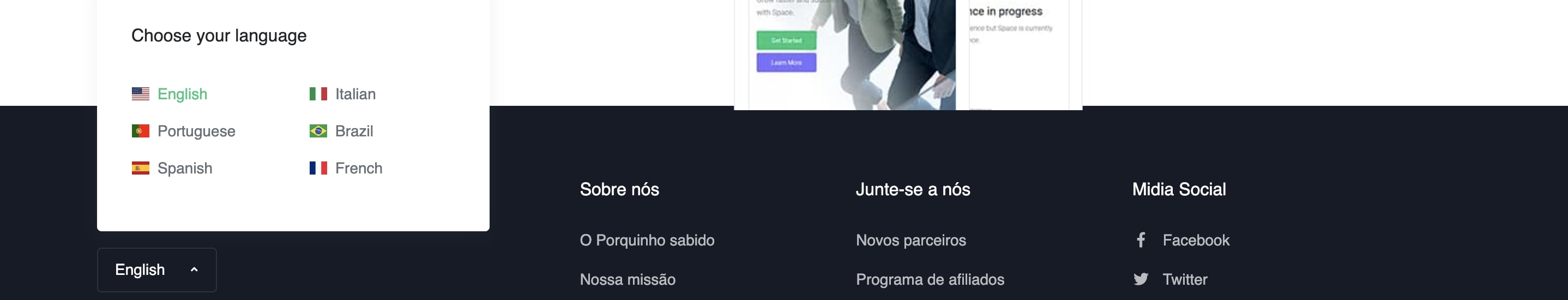 O PS/DCP permite duas abordagens distintas para a operação em multi-idioma. a) Criando um novo Modulo de Apresentação de forma que os sites em diferentes idiomas aparentem não ter relação entre si, fucionando de forma independente, b) Utilizando o seletor de idiomas no mesmo Modulo de Apresentação permitindo que o mesmo site seja apresentqados em vários idiomas, como no exemplo abaixo: